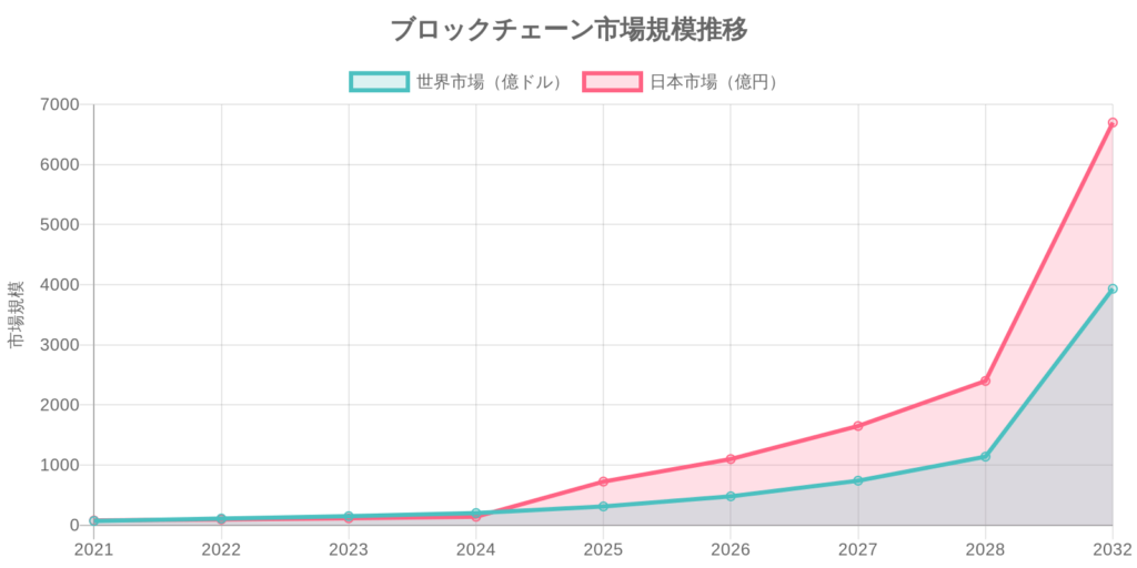 世界のブロックチェーン市場は2025年に約311.8億ドルに達し、2032年には約3,934.2億ドルに成長すると予測されています(Fortune Business Insights)。日本市場も2025年度には7,247億円に達する見込みで(トレードログ)、経済産業省は潜在的市場規模を約67兆円と試算しています。
